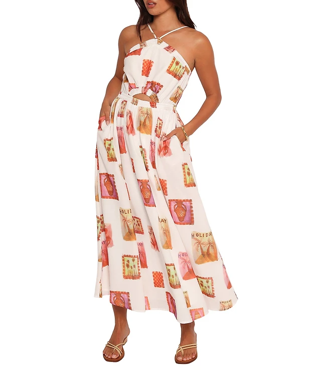 Petal & Pup Madi Abstract Postcard Print Halter Neck Sleeveless Cut Out Fit And Flare Maxi Dress