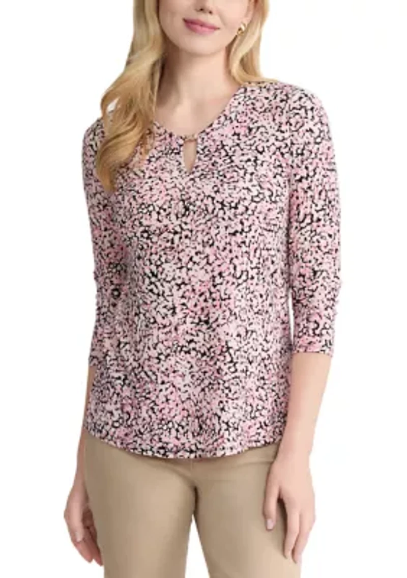 Petite 3/4 Sleeve V-Neck Print Top with Trim