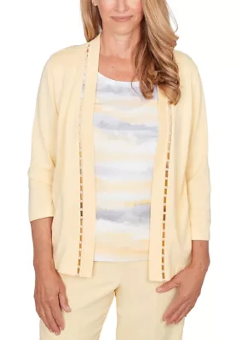 This Alfred Dunner top has soft biadere stripes peeking out from beneath a coordinating knit overlay with pearl-studded ribbon details along the front, creating a two-in-one design with built-in ease. The crew neckline is accented with subtle embellishment, while three-quarter sleeves fall in a straight, tailored cut. Pullover Collared neck Three-quarter sleeves Unlined Imported Product Specifications 23" L Material & Care Cotton blend Hand wash