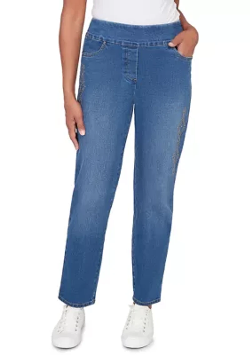 Designed in a shorter inseam for easy wear, these Alfred Dunner denim pants sparkle with geometric heat-set embellishments along the leg. Front pockets and a smooth elastic waistband add comfort and function, while the straight-leg cut keeps the look classic. Elastic waistband Unlined Classic fit Straight leg Imported Product Specifications Short length 27" inseam Material & Care Cotton, polyester, spandex Machine washable