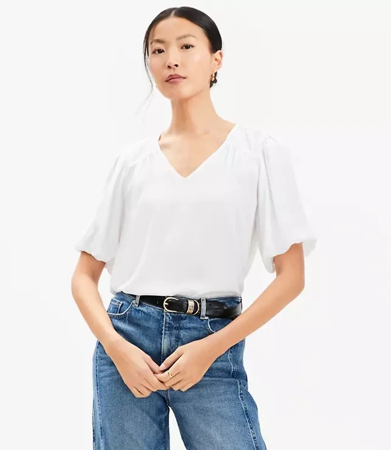 Softly shirred and finished with a soft knit back, this fluid woven top bursts into bloom with bohemian - glam bubble sleeves. V - neck. Short sleeves with elasticized cuffs., Bullet1: 24"long, Imported:, Fit: Relaxed an easy shape that's just shy of loose, Length: Regular - hits below natural waist, Fabrication: 100% Polyester, Garment Care: Machine Washable Loft Petite Bubble Sleeve Mixed Media Blouse Size 2XS White Women's by Loft Size Petite - 2XS White Women's V - Neck, Short Sleeve Blouse Tops Wear To Work 100% Polyester Machine Washable