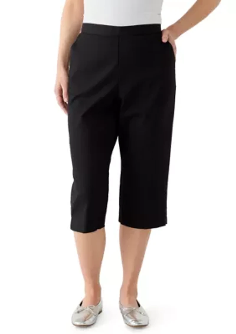 Easy and versatile, these Alfred Dunner capri pants are styled in soft twill with a comfortable elastic waistband. Slant pockets add function, while button accents at the hem bring a touch of detail to the simple design. Elastic waistband Unlined Regular fit Imported Product Specifications Capri length 19" inseam Material & Care Cotton, polyester, spandex Machine washable