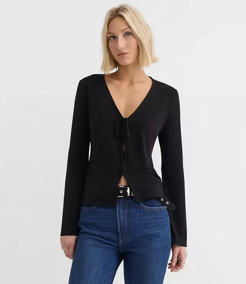 Styled with an adjustable tie front and sleek slit cuffs, this lush stretch crepe jersey top is our newest ( and flirtiest ) favorite. V - neck with ties. Long sleeves, Hit: Hits at hip, Imported:, Length: 21 3/4"long, Fabrication: 94% Polyester 6 Spandex, Garment Care: Machine Washable Loft Petite Crepe Jersey Tie Front Top Size 2XS Black Women's by Loft Size Petite - 2XS Black Women's V - Neck, Long Sleeve Blouse Tops Wear To Work 94% Polyester 6% Spandex Machine Washable