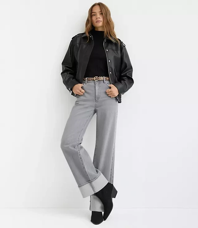 Cuffed High Rise Wide Leg Jeans Grey