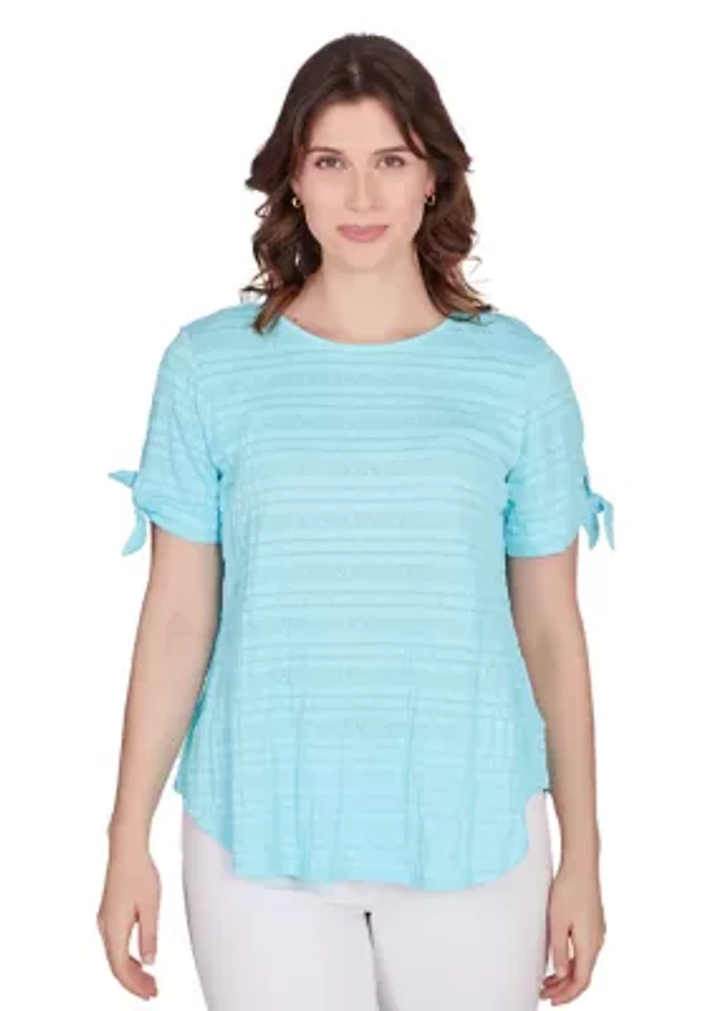 Look sharp and stand out in this decorative smocked knit top detailed with a scoop neck and short sleeves with ties. Pullover Scoop neck Short sleeves Unlined Imported Product Specifications 25.5" L Material & Care Cotton, polyester, spandex Machine washable