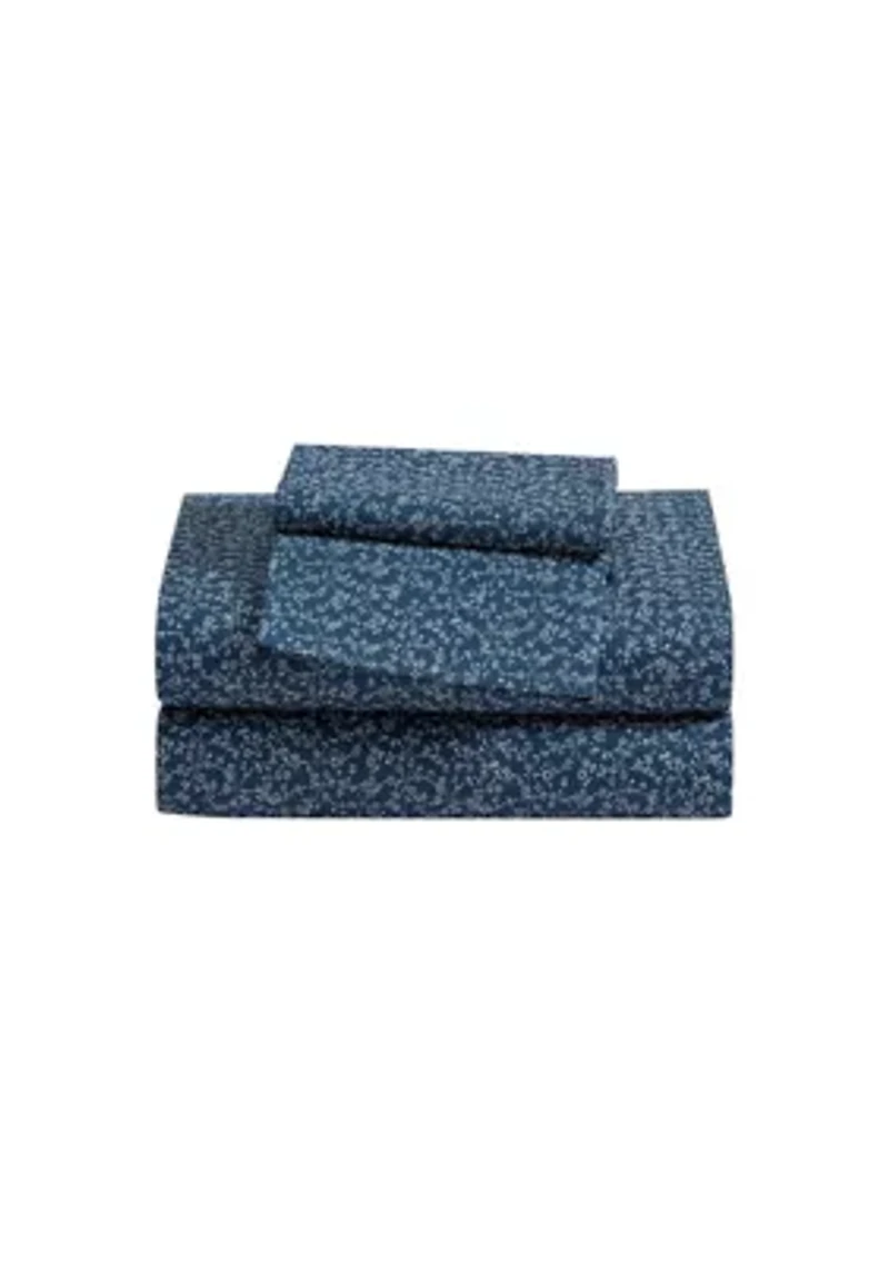 Bring relaxed, heritage-inspired comfort to your bedroom with the Eddie Bauer petite floral sheet set. Inspired by nature-driven design and timeless outdoor style, this delicate petite floral print features small-scale white blossoms scattered across a rich dark blue indigo ground, creating a look that feels classic, calming, and effortlessly refined. The intricate allover pattern adds subtle texture and visual interest while staying true to Eddie Bauer’s outdoor lifestyle heritage. Crafted from printed 100% cotton percale, these bed sheets deliver a crisp, breathable, and lightweight feel designed for cool, comfortable sleep year-round. The flat sheet and pillowcases offer a smooth, tailored drape, while the fitted sheet features fully elasticized edges and deep pockets for a secure fit on mattresses up to 15 inches deep. Perfect for layering with quilts, duvets, or comforters, this sheet set complements casual bedrooms, guest rooms, and nature-inspired spaces with ease. Built for everyday durability and easy care, it reflects Eddie Bauer’s commitment to functional comfort and lasting quality. Includes one flat sheet, one fitted sheet, and two pillowcases (one pillowcase for twin and twin xl). Machine washable. 4-Piece Set Soft 200 Thread Count Floral India Imported Product Specifications King Flat Sheet: 108"W x 102"L, King Fitted Sheet: 78"W x 80"L, King Pillowcases: 40"W x 20"L Material & Care Cotton Machine washable