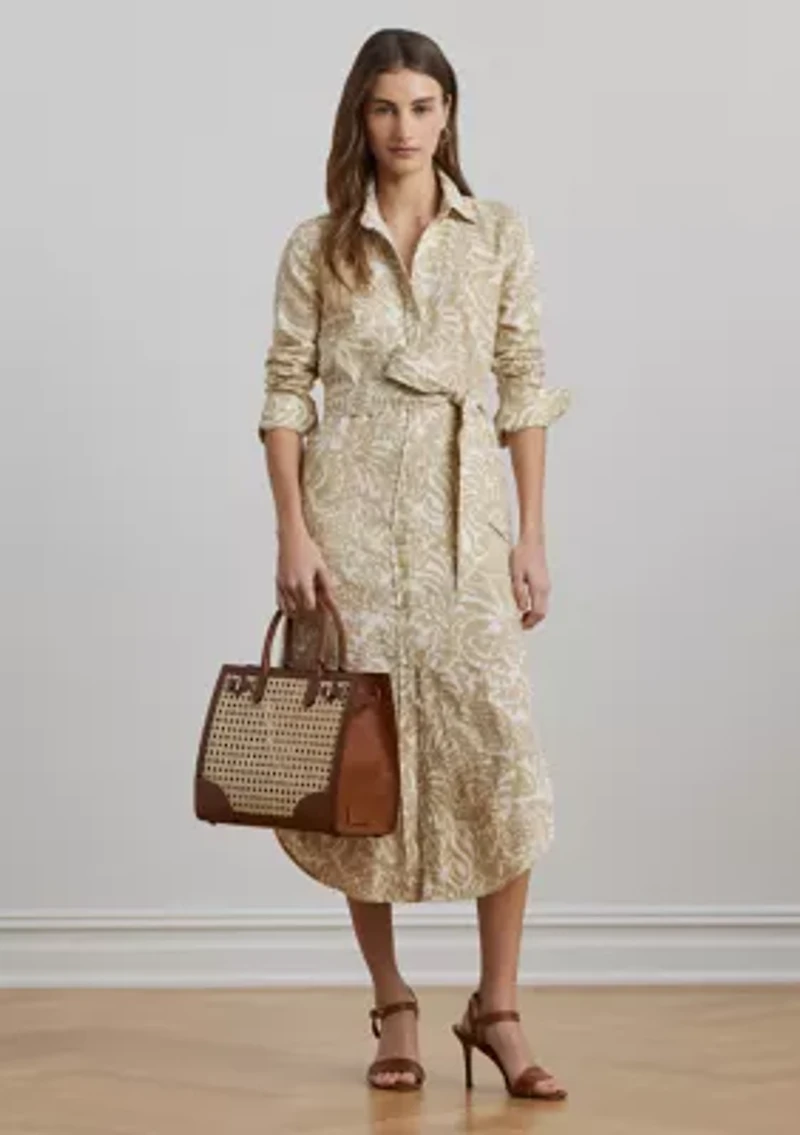 Crafted with light-as-air linen, this shirtdress showcases the season’s two-tone, embroidery-inspired floral motif. A self-belt at the waist creates a defined silhouette, while “Lauren Ralph Lauren”–engraved buttons provide signature style. Straight fit Intended to hit at the mid-calf Size Petite 8 has a 46.5" body length and a 31.75" sleeve length Dress length and sleeve length are taken from the center back of the neck Dress length changes 0.5" between sizes Sleeve length changes 0.25" between sizes Point collar Buttoned placket “Lauren Ralph Lauren”–engraved buttons Long sleeves with buttoned barrel cuffs Side on-seam pockets Threaded belt loops Comes with a removable self-belt Back yoke Shirttail hem Unlined Imported Material & Care Linen Machine washable