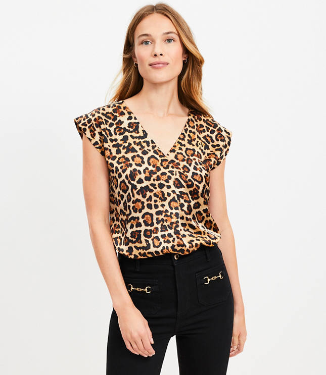Petite Leopard Print Satin Cap Sleeve V-Neck Top in Chattanooga, TN