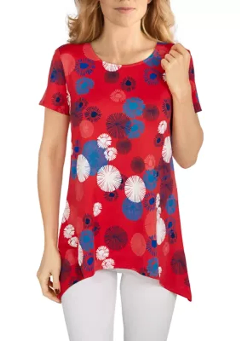 This puff print women's top features a scoop neckline, short sleeves, a shark bite hemline and a fun firework print. Pullover Scoop neck Short set-in sleeves Unlined Imported Product Specifications 25" L Material & Care Polyester, spandex Hand wash