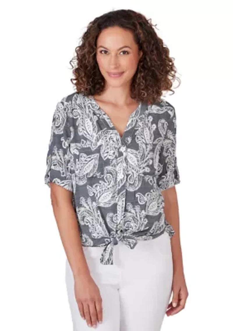 Flaunt your warm-weather style in this silky slub top detailed with a stand collar, lovely paisley print, a tie-front and elbow roll-tab sleeves. Button closure Stand collar Short cap sleeves Unlined Imported Product Specifications 26" L Material & Care Rayon, polyester Machine washable