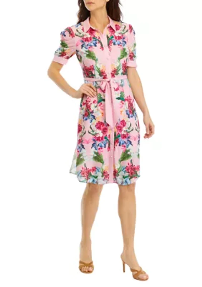 A beautiful rose print romanticizes this dress from T TAHARI. Button closure Collar Short ruched sleeves Partially lined Imported Product Specifications 44" L Material & Care Polyester Machine washable