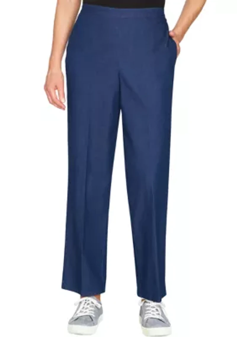 A signature fit denim women's pant by Alfred Dunner that is designed in easy-wear fabric with your comfort in mind. Elastic waistband 2 on-seam pockets Flared leg Imported Product Specifications 28.5 in Inseam Material & Care Cotton, polyester, spandex Machine washable