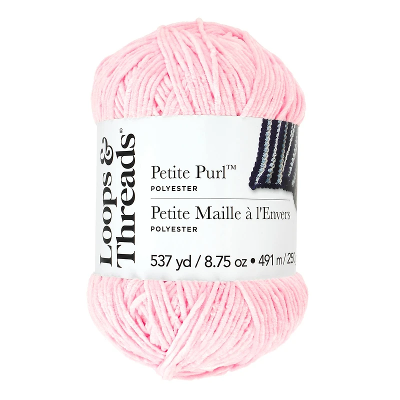 This Petite Purl yarn by Loops & Threads features a thinner skein than even our Sweet Snuggles Lite and Chenille Home Slim yarns. This makes it great for getting a tighter stitch on your warm weather apparel items. Knit or crochet cardigans, sweaters, vests, hats, amigurumi plushies and more with this medium weight, polyester yarn that has just the right amount of softness and shine.We understand the importance of dye lots and will try to match dye lots for your order, however, we cannot guarantee all skeins will be the same dye lot.Weight: Medium (4)Contents: 100% polyesterSkein Weight: 8.75 oz. / 250 gYardage: 537 yd. / 491 mKnitting Gauge:15 sts - 26 rows = 4" (10 cm)Crochet Gauge:15 sc - 26 rows = 4" (10 cm)Suggested Knitting Needle:4.5 mm, US - 7Suggested Crochet Needle:4.5 mm, US - 7