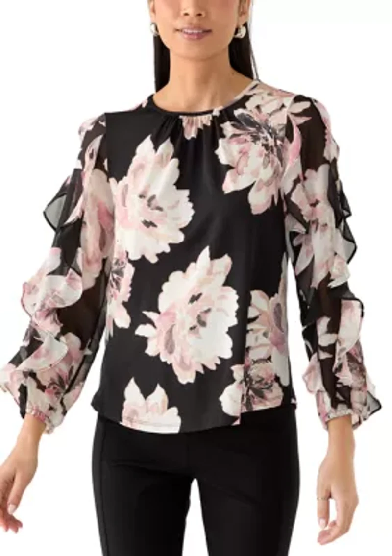 This Anne Klein blouse is perfect for any occasion, featuring charming flutter sleeves and a stylish print for a chic look all day long. Pullover Crew neck Long flutter sleeves Unlined Imported Product Specifications 23.5" L Material & Care 92% polyester, 8% elastane Machine washable