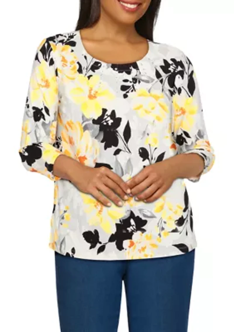 Alfred Dunner's gorgeous floral knit top is designed with a neutral gray ground that invites a pop of color to brighten your day. This 3/4 sleeve top is fashioned with beautiful embellishments at the pintuck round neckline. Pullover Round neck 3/4 set-in sleeves Unlined Imported Product Specifications 22.5'' L Material & Care Cotton, spandex Machine washable