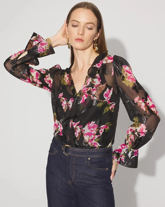 Intro Metallic Clip Dot Split V-Neck 3/4 Sleeve Ruffle Blouse