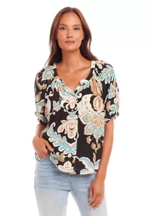 Indulge in the effortless charm of this peasant top from Karen Kane. Its vibrant floral print and soft viscose fabric create a flattering silhouette. The short puff sleeves and scoop neckline add a touch of femininity, while the relaxed fit ensures comfort. Versatile for any occasion, this top can be dressed up or down, making it a wardrobe essential. Button closure V-neck Short puff sleeves Unlined Imported Product Specifications Size MP: 22.87" L Material & Care Viscose Hand wash