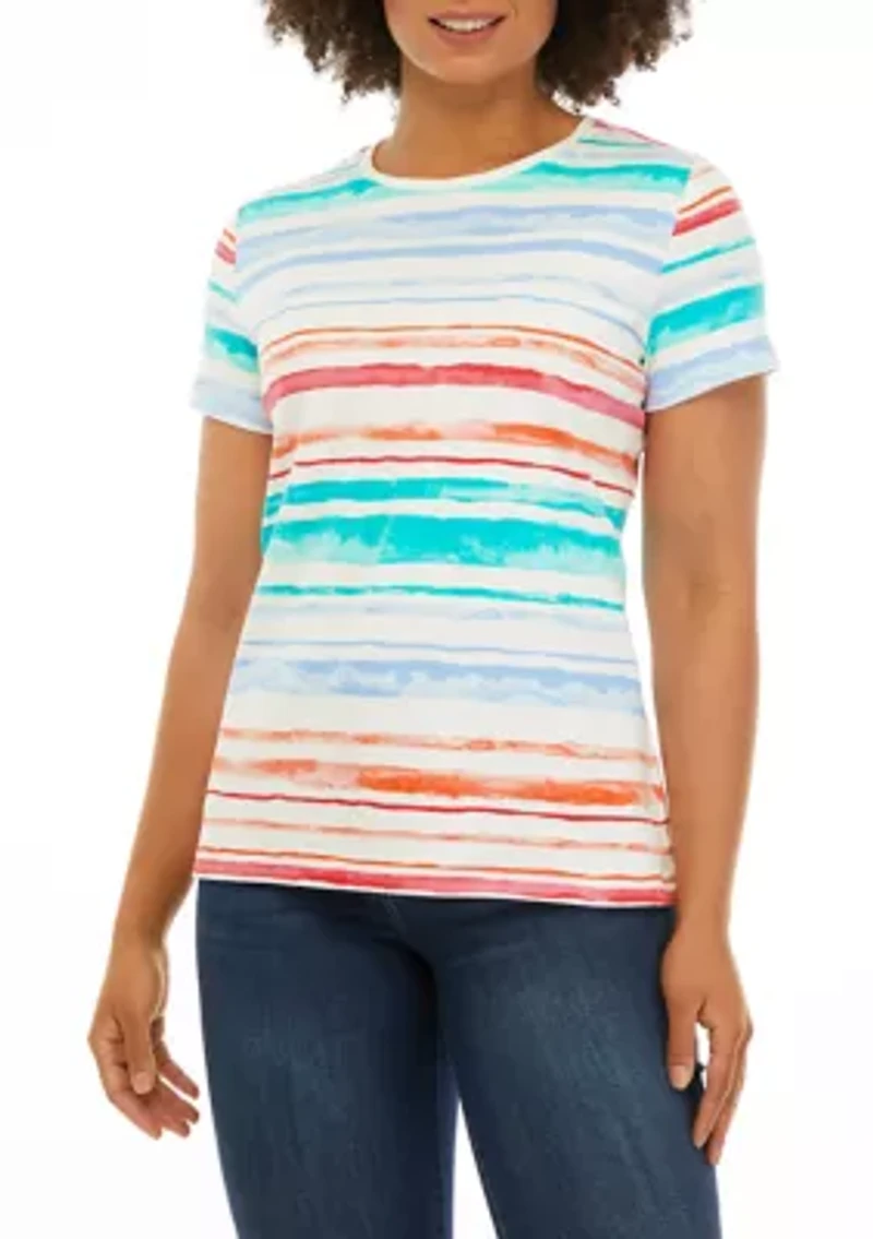 Colorful stripes add a breezy touch to this chic top from Kim Rogers®. Pullover Crew neck Short set-in sleeves Imported Belk Exclusive Product Specifications 25" L Material & Care Cotton Machine washable