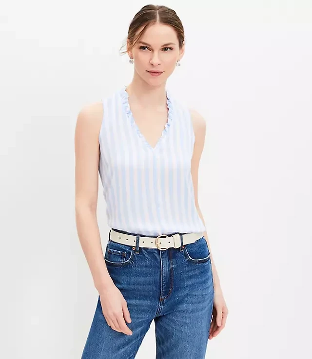 Petite Striped Ruffle V-Neck Mixed Media Shell