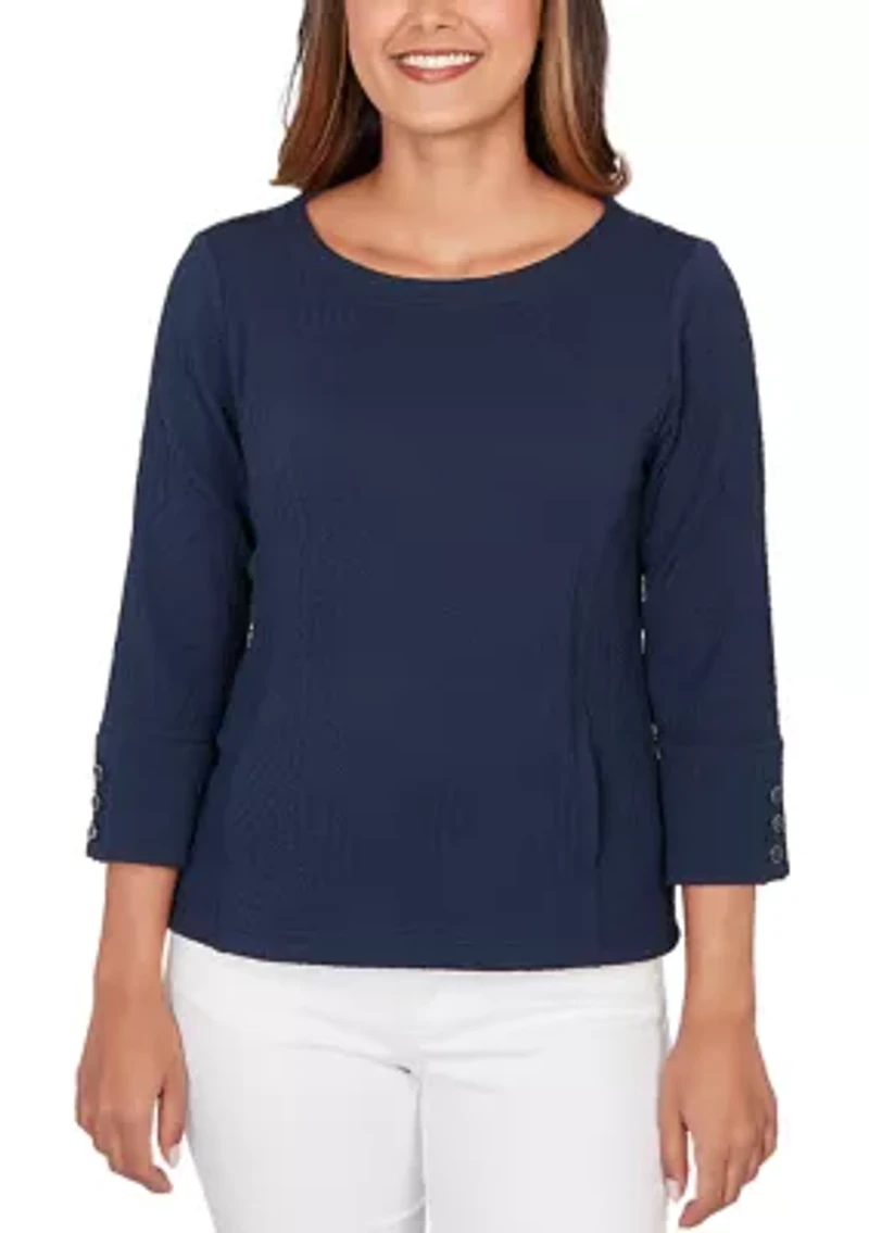 Designed with a flattering bateau neckline, this boxy knit top from Ruby Rd adds dimension with its abstract pucker texture. The 3/4 sleeves are finished with button accents for a polished touch that plays well from casual days to evenings out. Pullover Boat neck 3/4 sleeves Unlined Imported Product Specifications 21.5" L Material & Care Polyester, spandex Machine washable