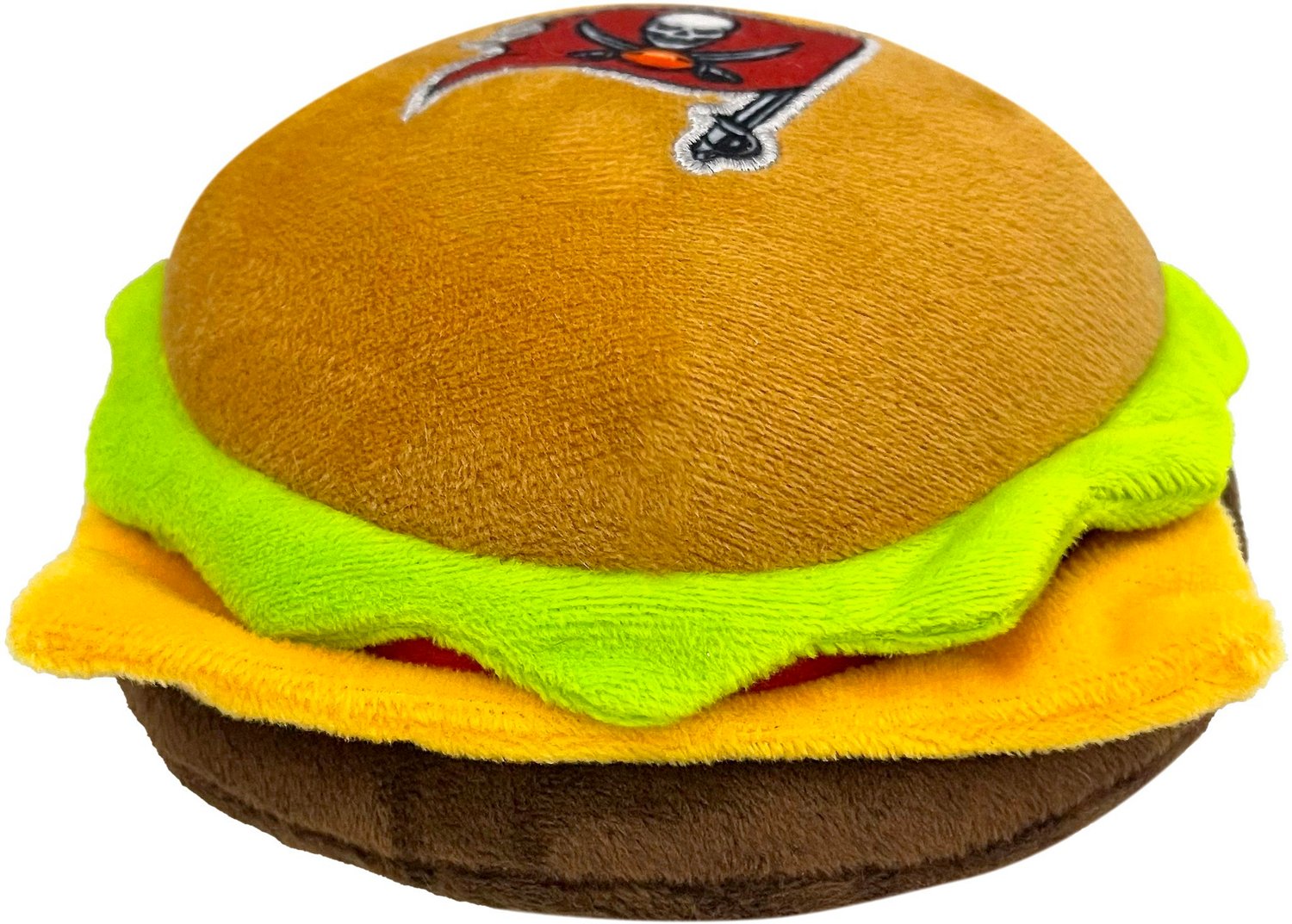 Pets can join in on game day with the Pets First Tampa Bay Buccaneers Hamburger Dog Toy. This plush fabric chew toy comes with 4 internal squeakers for more engaging play, as well as a colorful graphic to celebrate your pet's favorite team.