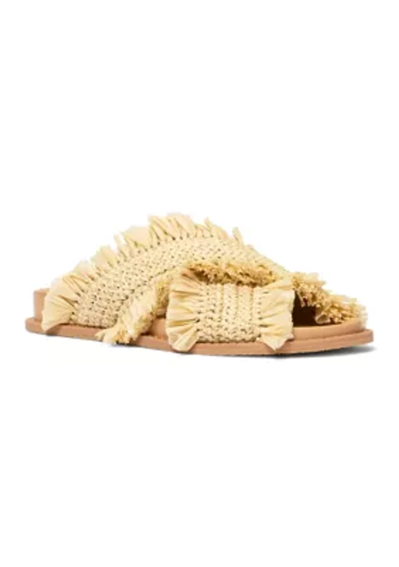 These fashionable MICHAEL Michael Kors sandals feature a stylish cross-over design for a flattering fit, perfect for everyday wear. Slip-on Imported Product Specifications Medium width Material Lining: 100% synthetic; Outsole: textile flocked Rayon