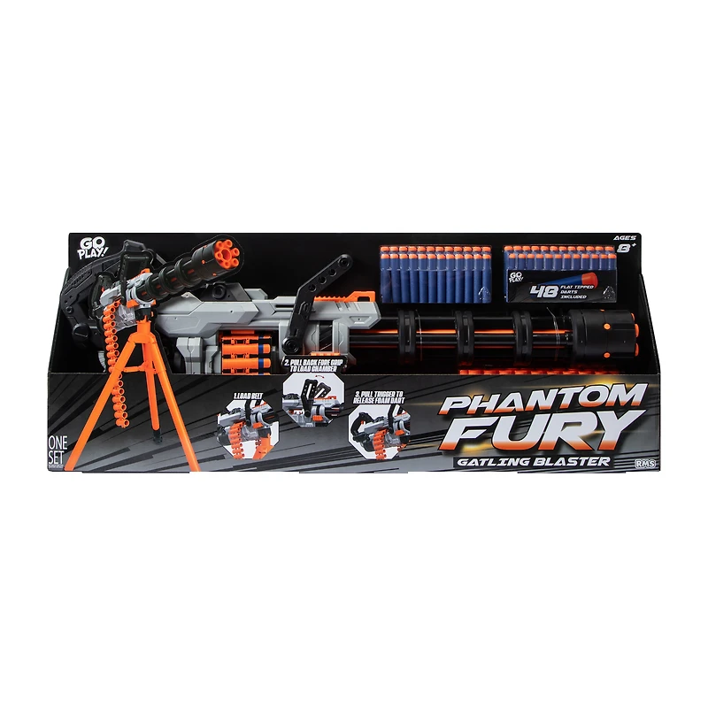 • The Phantom Fury Gatling Blaster Set is ready to power up your nerf battles with fast-paced, motorized action that brings serious energy to every backyard matchup. This motorized blaster comes with 48 darts so you can keep the action going during your next battle session.