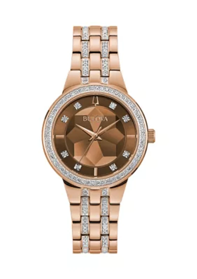 Stainless steel case with blue faceted mineral glass dial to convey a 3-D look. Embellished with 120 Swarovski® Crystals on the stainless steel case and bracelet with a short fold over buckle with pushers, flat mineral crystal, water resistance to 30 meters. 120 Swarovski® Crystals Buckle closure Quartz movement Analog dial Water resistant up to 30 meters Polished finish 3-year limited warranty Imported Belk Exclusive Product Specifications 32.5 mm round case Material & Care Stainless steel Requires specialty care