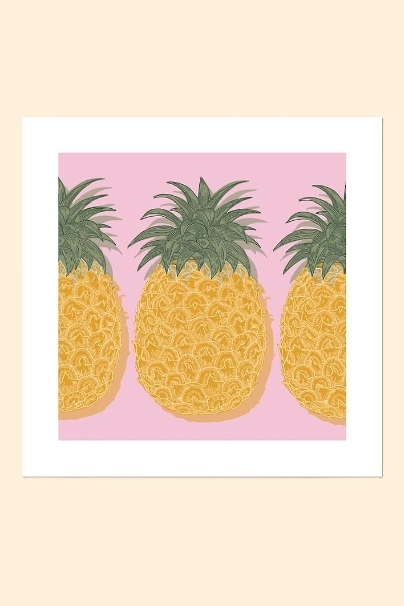 Create a tropical, high-vibe oasis in your space with this playful pineapple art print that captures the bold spirit of this iconic fruit through rich color and intricate detail. Featuring golden pineapples lined against a soft pink backdrop, this piece brings sunny, feel-good energy to kitchens, studios, bedrooms, or bohemian style gallery walls.Printed on archival paper for lasting quality and vibrancy, this limited-edition digital print is part of a release of only 100 prints. Each piece comes unframed, allowing you to style it in a way that feels personal to your space. Created by Dallas-based artist Suzana Gordon, owner of Earthbound Trading Company, this artwork reflects her deep love of nature and radiant color. Originally from Brazil, Suzana brings the vivid influence of her heritage and her background in surface pattern design to every piece she creates. Whimsical yet sophisticated, this limited-edition print adds a pop of color and a touch of nature-inspired joy to your collection. ~ Step inside Suzana's world and discover the inspiration and stories behind each piece: What inspires your designs, are there personal stories, memories, or experiences that often influence your work? I am inspired mostly by nature. Farmers markets especially remind me of my upbringing in Brazil, the unusual tropical fruits with their distinct aromas, textures, and abundance of bright and vibrant colors. What feeling or atmosphere do you hope people experience when they bring your pieces into their space? I hope my art can provide a soothing backdrop for modern living. That they can bring peace, joy, a sense of calm, and happiness into any dwelling. How do you approach choosing subjects, materials, or color palettes, and is there meaning behind those decisions? It’s subtle guidance from past trips, long hikes, and random encounters that have brought joy and meaning to my life; I try to hold on to the feelings and then express them through my art. What medium are your pieces created in? Ex: pencil drawing, ink pen, gauche painting, digital drawing, etc. I use ink pens, markers, watercolors, and gauche to add color and digital art programs when creating prints and patterns. Recently, I've fallen in love with screen printing and how imperfect it is.