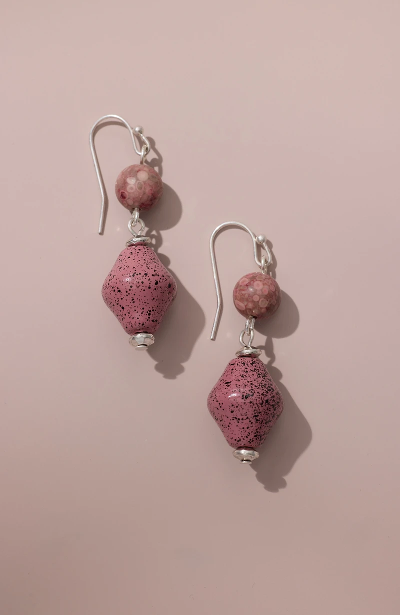 Our elegant earrings feature simple stacks of semiprecious sunstone and ceramic beads in cool pink tones. Complete the set with our coordinating Pink Beaded Necklace. Fishhook.
