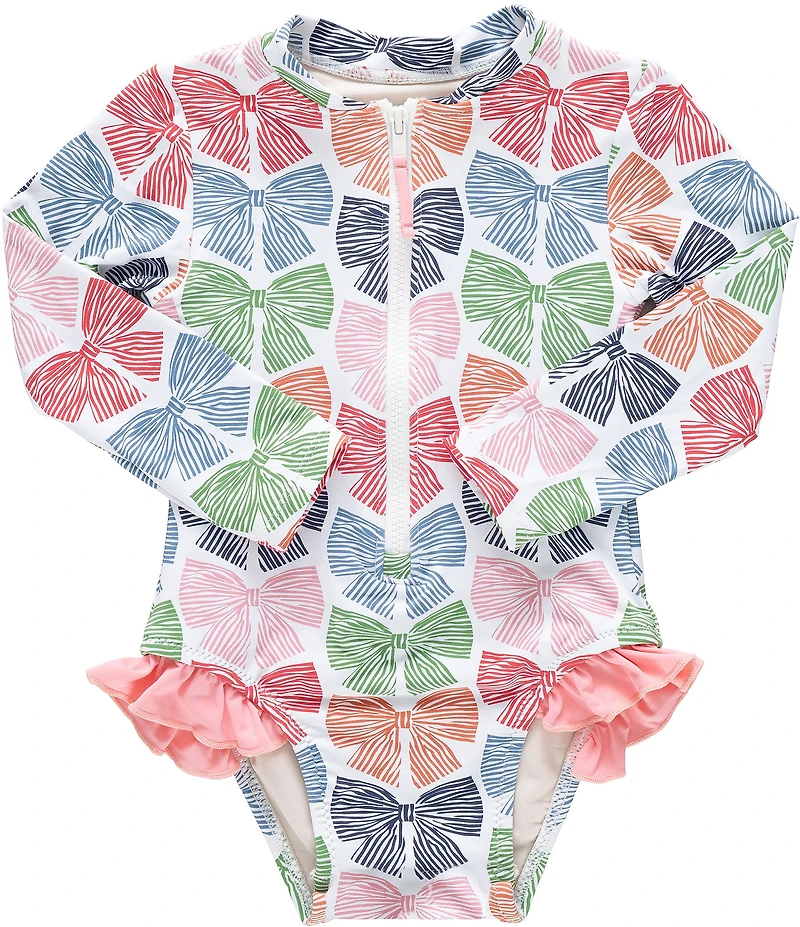 From Pink Chicken, this swimsuit features:  Allover multi bows print  Round neckline  Long sleeves  Zip-Front closure  Leg ruffle detail  Polyester/elastane Machine wash/line dry Imported.