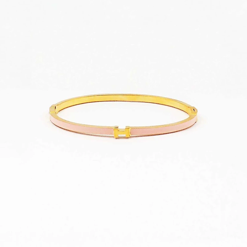 Add a pop of soft color to your bracelet stack with this elegant pink enamel bangle. Designed with a polished gold-tone hinge closure and a slim, minimalist silhouette, it’s a refined accessory that pairs beautifully with both casual and dressy styles.