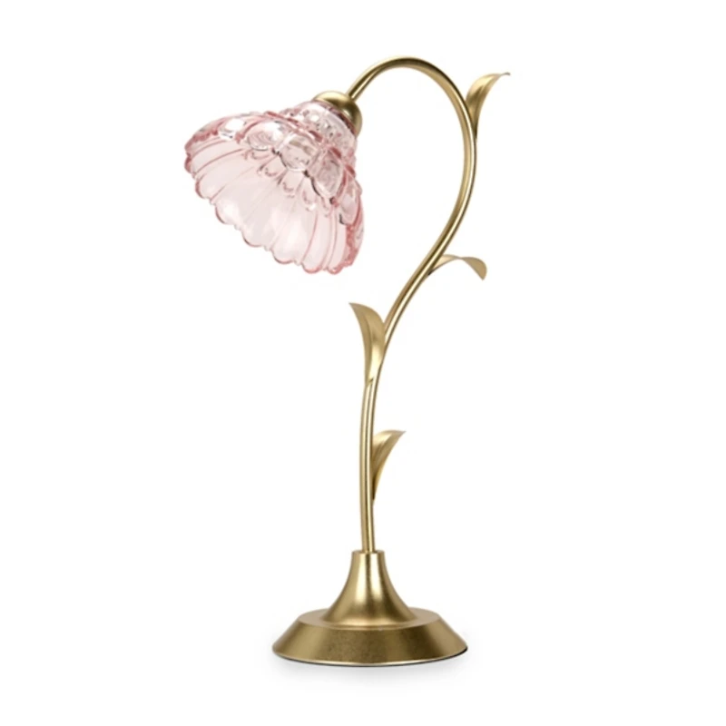 Fill your space with timeless elegance and warm light with this Pink Glass Flower Table Lamp! Its delicate glass shade, shaped like a blooming flower, radiates spring beauty! Lamp measures 20.5H in. Crafted of metal and glass Gold finish Curved body with leaf accents Pink glass shade with a floral shape Shade measures 4H x 6.5 in. in diameter Socket accommodates a 25-watt, type B bulb Switch type: On/off inline rotary switch Features a clear, 5ft. plug-in cord Care: Dust with a soft, dry cloth. Do not exceed specified wattage. WARNING: Cancer and Reproductive Harm - For more information go to www.P65Warnings.ca.gov . Contact your local Kirkland's store for availability. Quantities and selection may vary by location.