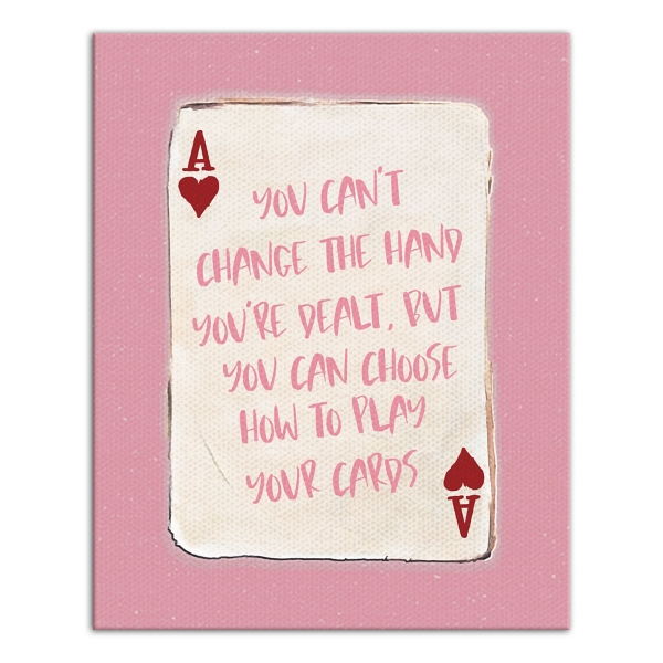 Bring positivity to your space with this Pink Playing Card Canvas Art Print! You'll love the motivating message this print features. The playing card design gives it the perfect cute and modern touch! Overall dimensions Width: 16 in. Depth: 1.25 in. Height: 20 in. Distinctively printed on stretched canvas Features a playing card design with text Reads, "You can't change the hand you're dealt, but you can choose how to play your cards" Hues of pink, red, and white Weight: 1.81 lbs. Hangs from back-mounted hardware Care: Dust with a soft, dry cloth. This item is available at Kirklands.com only, not available in stores. Please note: this item cannot be shipped to APO/FPO addresses.
