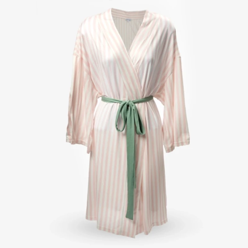 Whether you're getting glammed up or winding down with a skincare routine, slip into this Pink Striped Small Robe. The soft, lightweight fabric will leave you lounging in comfort and luxury. Small size: 0-2 See More Information for measurements Crafted of 92% polyester and 8% spandex Striped pattern Solid green robe belt Hues of pink, white, and green Care: Machine wash on delicate cycle. Contact your local Kirkland's store for availability. Quantities and selection may vary by location. Sold in stores under item number 321265. WARNING: Cancer and Reproductive Harm - For more information go to www.P65Warnings.ca.gov .
