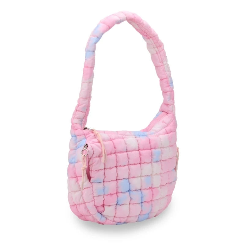Whether you're hitting the gym, walking around campus, or packing for a sleepover, carry all the essentials in this Pink Tie Dye Puffy Tote Bag! Its lightweight construction, convenient pockets, and comfortable shoulder strap make it perfect for everyday use. Bag measures 14.75L x 4.7W x 11.8H in. Crafted of lightweight fabric Quilted construction Puffy design Features two (2) side pockets with zipper closure Includes one (1) interior pocket with zipper closure Tie dye print Hues of pink, blue, and white Pink rope accents Zipper closure Care: Spot clean only. Contact your local Kirkland's store for availability. Quantities and selection may vary by location. WARNING: Cancer and Reproductive Harm - For more information go to www.P65Warnings.ca.gov .