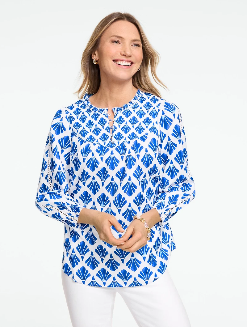 Accent your ensembles this season with the romantic lace trim on this feminine top. Crafted from cotton voile with dainty pintuck details and a painted fans print.