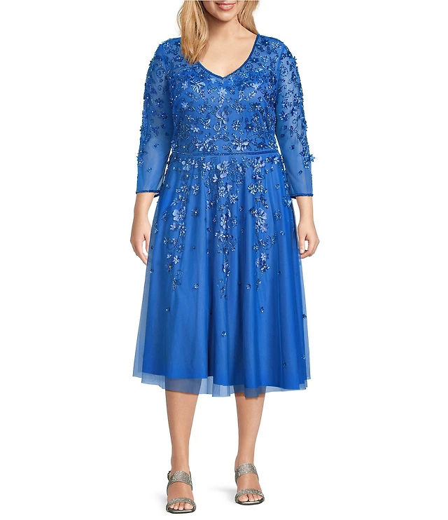 Pisarro Nights Plus Size V-Neck 3/4 Sleeve Beaded Mesh Floral Embroidered Midi Dress