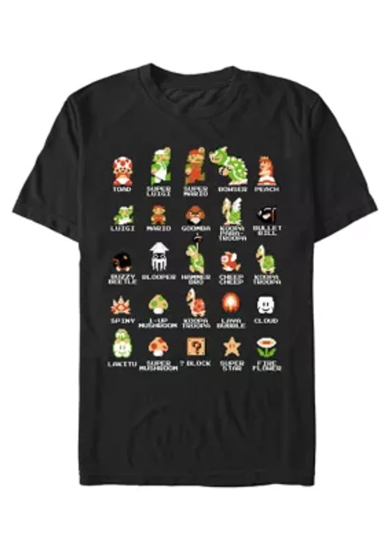 Get to know your classic Nintendo Super Mario Bros Character Guide Men's Tee! Bowser, Peach, Cheep Cheep, Fire Flower, and Spiny are just a few of the pixelated Super Mario Bros characters printed on this awesome Super Mario tee. Crew neck Short sleeve Screenprint Front Imported Material & Care Cotton Machine washable