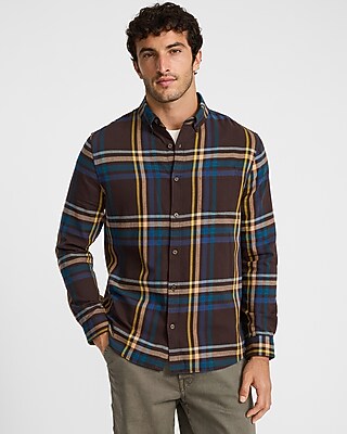 Our comfortable cotton stretch flannel shirt features a button-down collar, a patch chest pocket, and long sleeves.