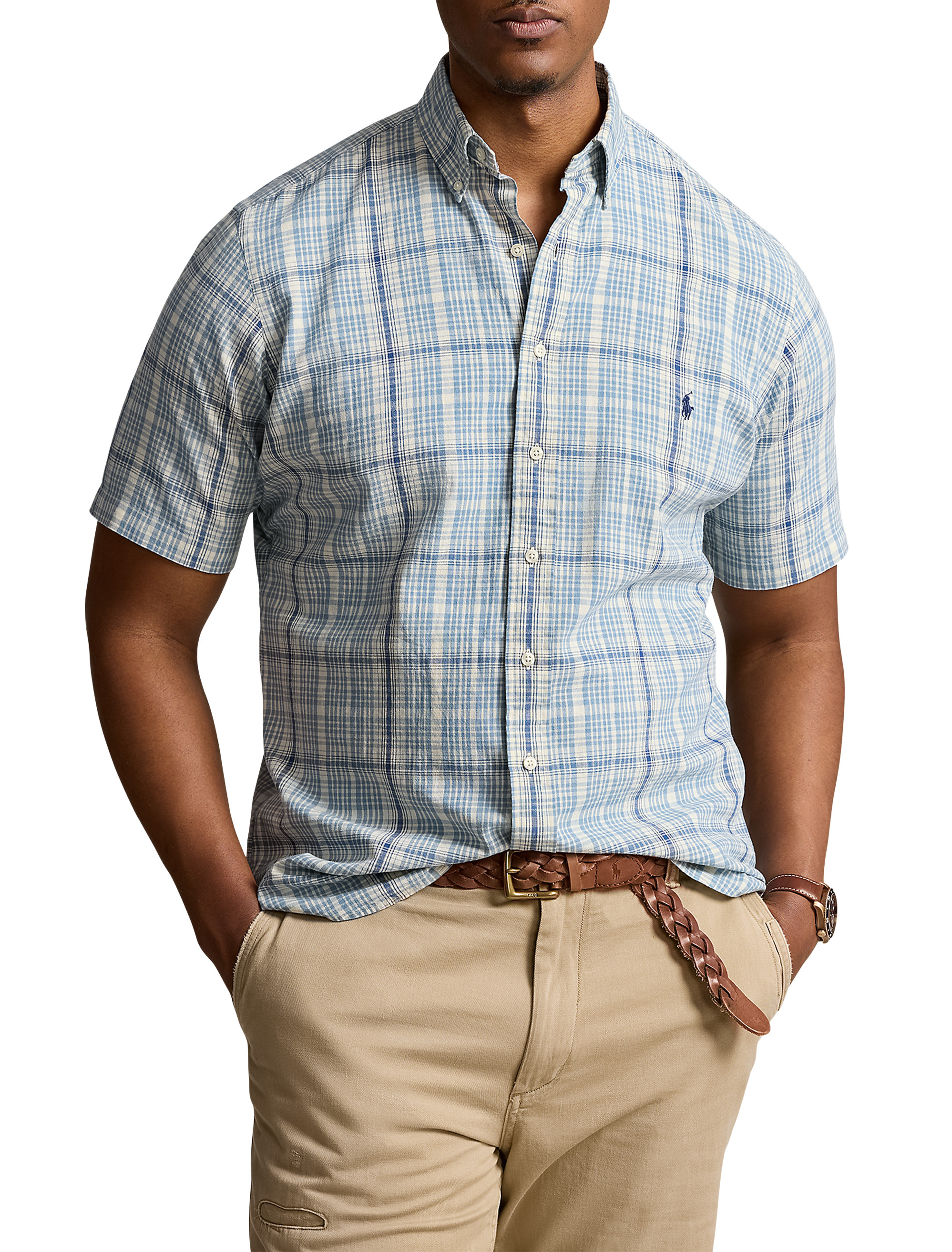 This plaid shirt is crafted with a blend of breathable linen and lightweight cotton, making it perfect for warm-weather days.