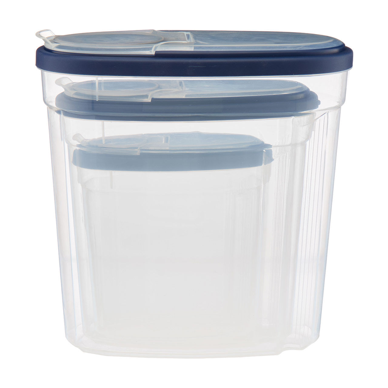 Each container features a secure, snap-lock lid in a sleek navy blue, ensuring an airtight seal that keeps your cereal crunchy and delicious for longer. The lids also include a convenient pouring spout, making it easy to serve cereal without spilling.