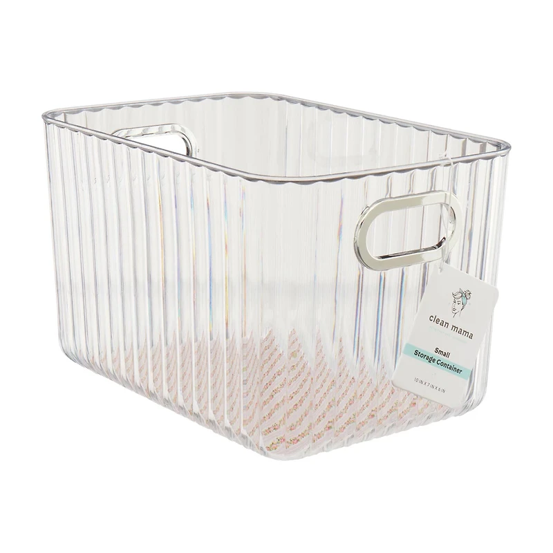 Organize your space with a touch of elegance using our Plastic Storage Bin in Pink Floral Stripe. This small-sized storage solution is perfect for tidying up and adding a charming accent to any room in your home.