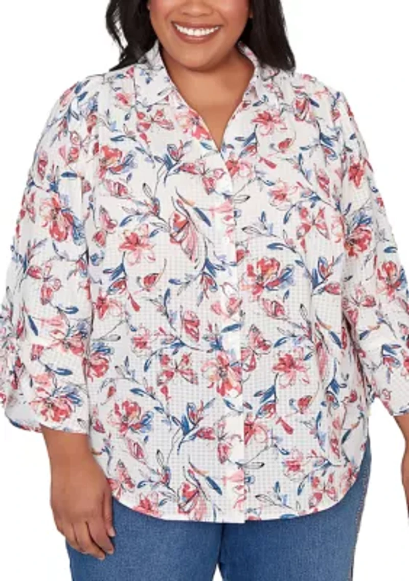 Etched florals and fluttering butterflies drift across this airy woven top from Alfred Dunner, creating a design that feels both artistic and delicate. A collared neckline and button front add structure, while tie sleeves lend a feminine touch. Light and graceful, it's a piece that brings a whisper of nature's beauty to your day. Button closure Collar 3/4 sleeves Unlined Imported Product Specifications 28.5" L Material & Care Polyester Machine washable