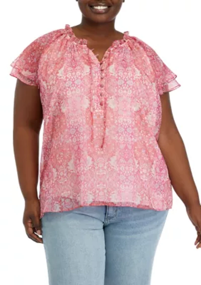 This billowy top with tiered sleeves from Philosophy showcases pretty silhouetted florals. Button closure Crew neck Short flutter sleeves Partially lined Imported Product Specifications 26.5" L Material & Care Polyester Machine washable