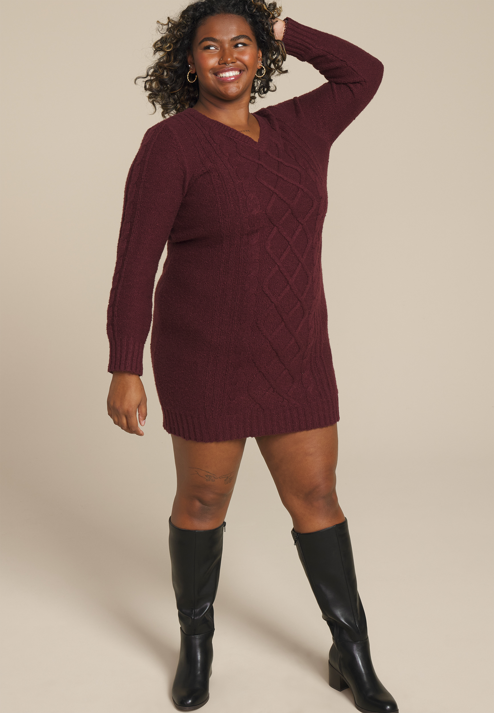 Plus Cable Knit V Neck Sweater Dress