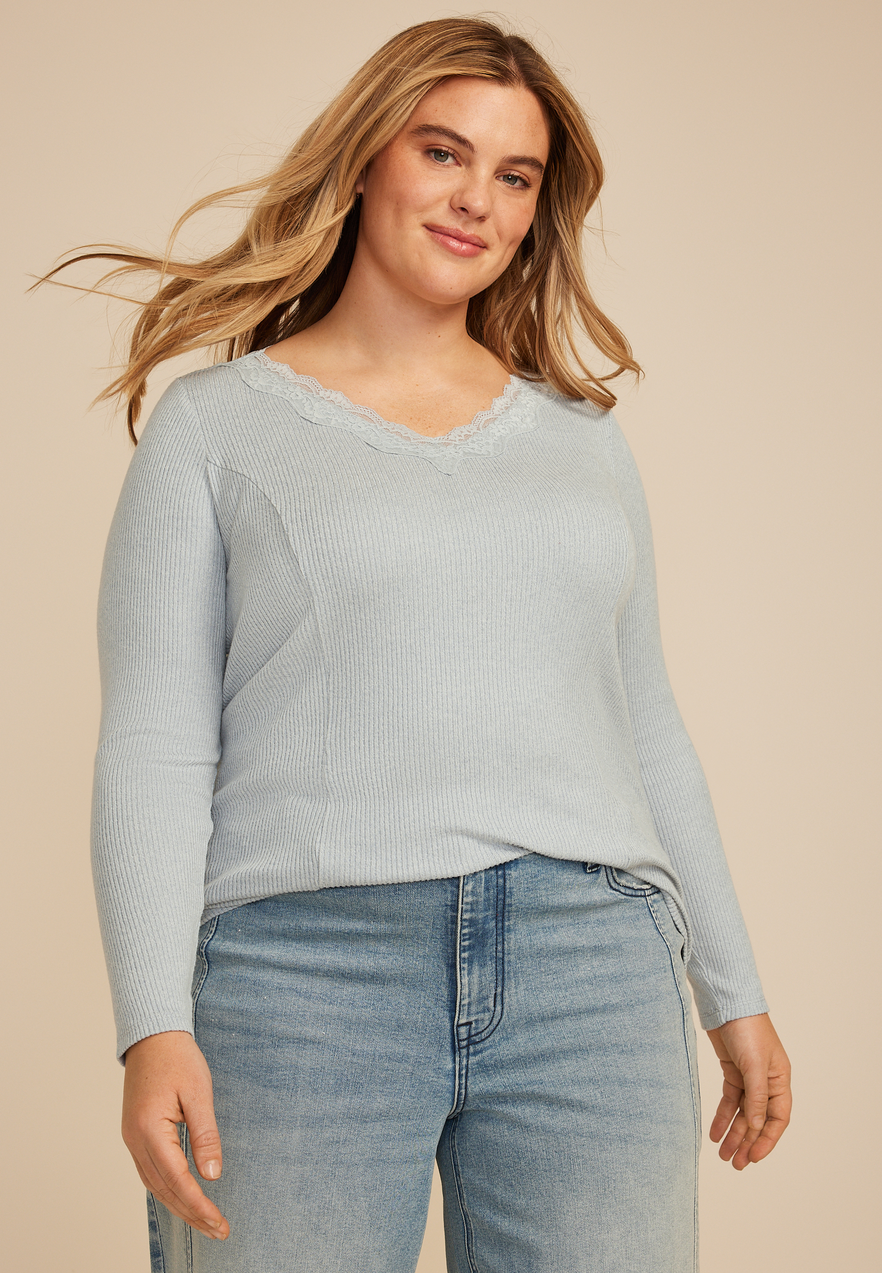 Plus Cozy Lace Trim V Neck Top