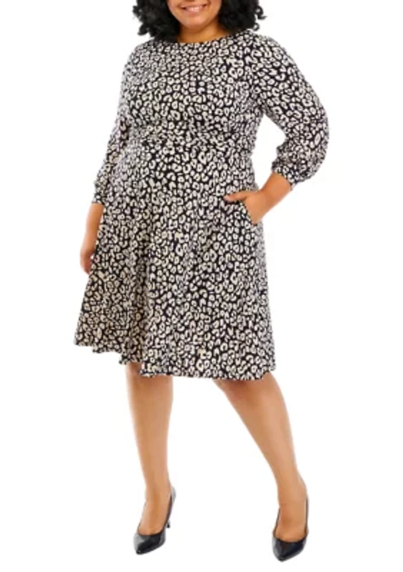 Plus Long Sleeve Boat Neck Leopard Print Fit and Flare Midi Dress in Chattanooga, TN