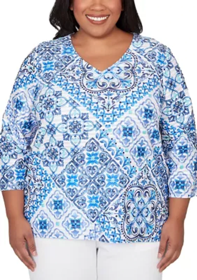 Reminiscent of hand-painted tiles, this V-neck top from Alfred Dunner features an intricate mosaic print in serene tones. The three-quarter sleeves and straight hemline complete the look with effortless artistry. Pullover V-neck 3/4 sleeves Unlined Imported Product Specifications 26" L Material & Care Polyester Machine washable