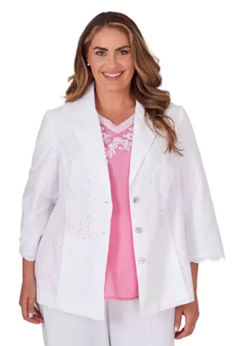 Embrace a stylish and timeless look with this white eyelet jacket from Alfred Dunner featuring a collared neckline, three-quarter sleeves and a straight hemline. Button closure Collar 3/4 sleeves Unlined Imported Product Specifications 26.5" L Material & Care Cotton Machine washable